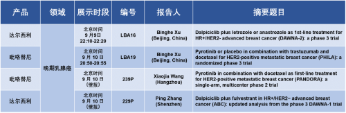 此外,在其他领域,达尔西利、氟唑帕利,以及未上市创新产品人源化抗PD-L1抗体阿得贝利单抗、微管蛋白抑制剂普那布林等产品相关研究入选了4篇壁报,下表为具体壁报编号及展示时间,让我们一起相约,见证多项研究成果公布。
