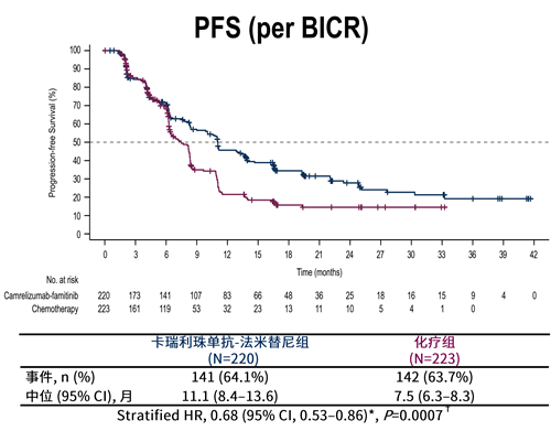 截至2025年6月10日,总计纳入443例受试者,卡瑞利珠单抗-法米替尼治疗组中PD-L1 CPS≥1的比例为93.2%,97.7%的受试者是转移性疾病,既往经过含铂化疗的比例是70.9%,其余患者基线特征如表1:
